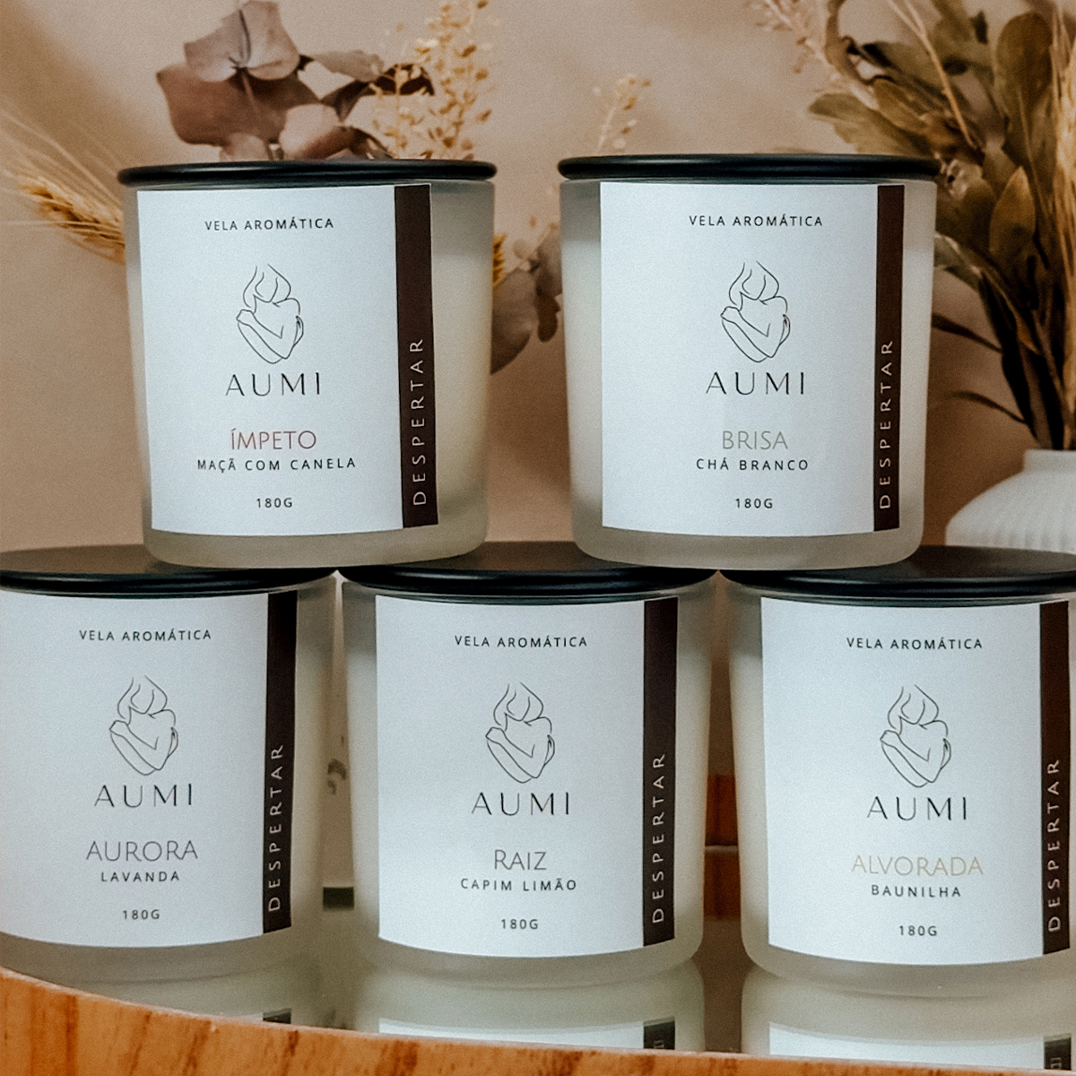 O Combo AUMI reúne as 5 velas aromáticas da linha premium (180g), cuidadosamente criadas para acompanhar diferentes estados de espírito, horários do dia e necessidades emocionais, do frescor revigorante ao aconchego.